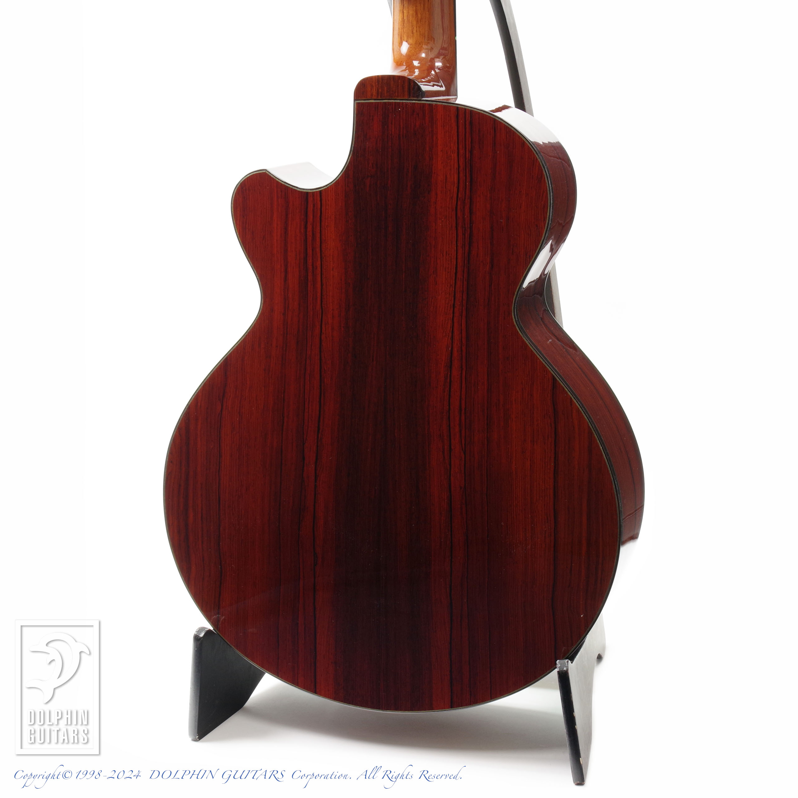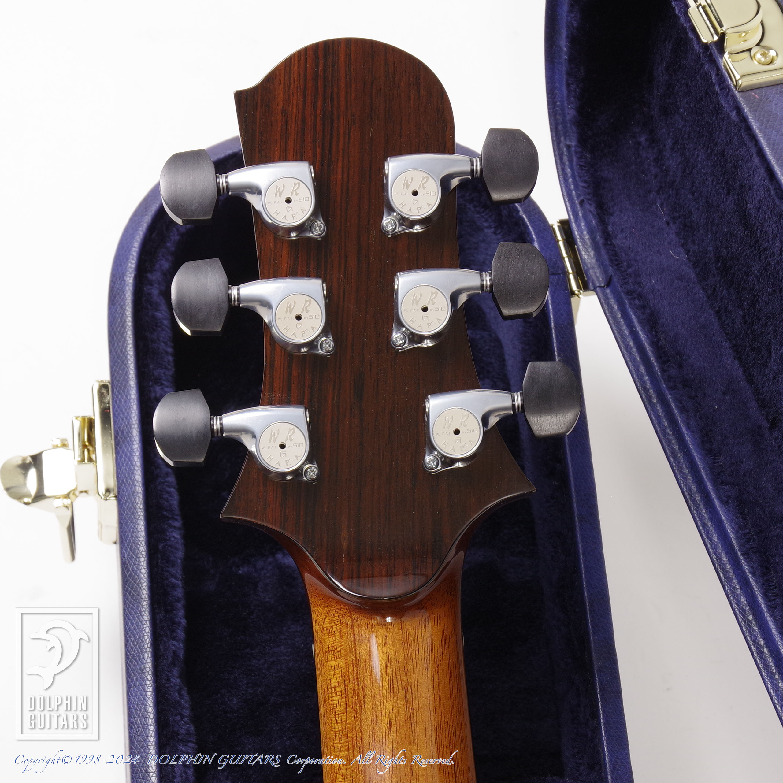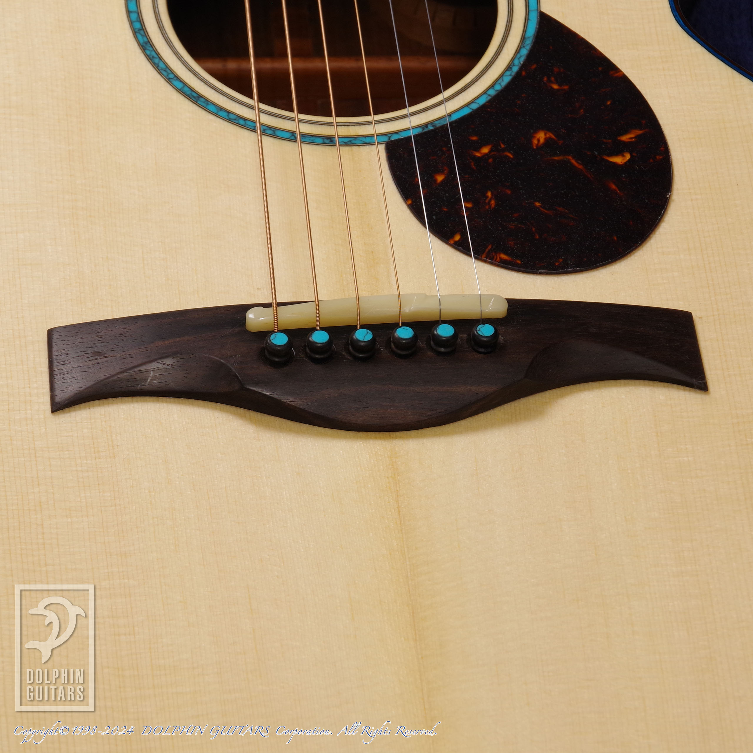 シルキーな木目のジャーマンスプルースをTopに、柾目の美しい最上級のココボロをS&Bに使用した極上の一本。木目の美しさももちろんですが、ターコイズを用いたロゼッタ装飾や独自のカッタウェイ形状などの小粋なデザインも見所の一つです。