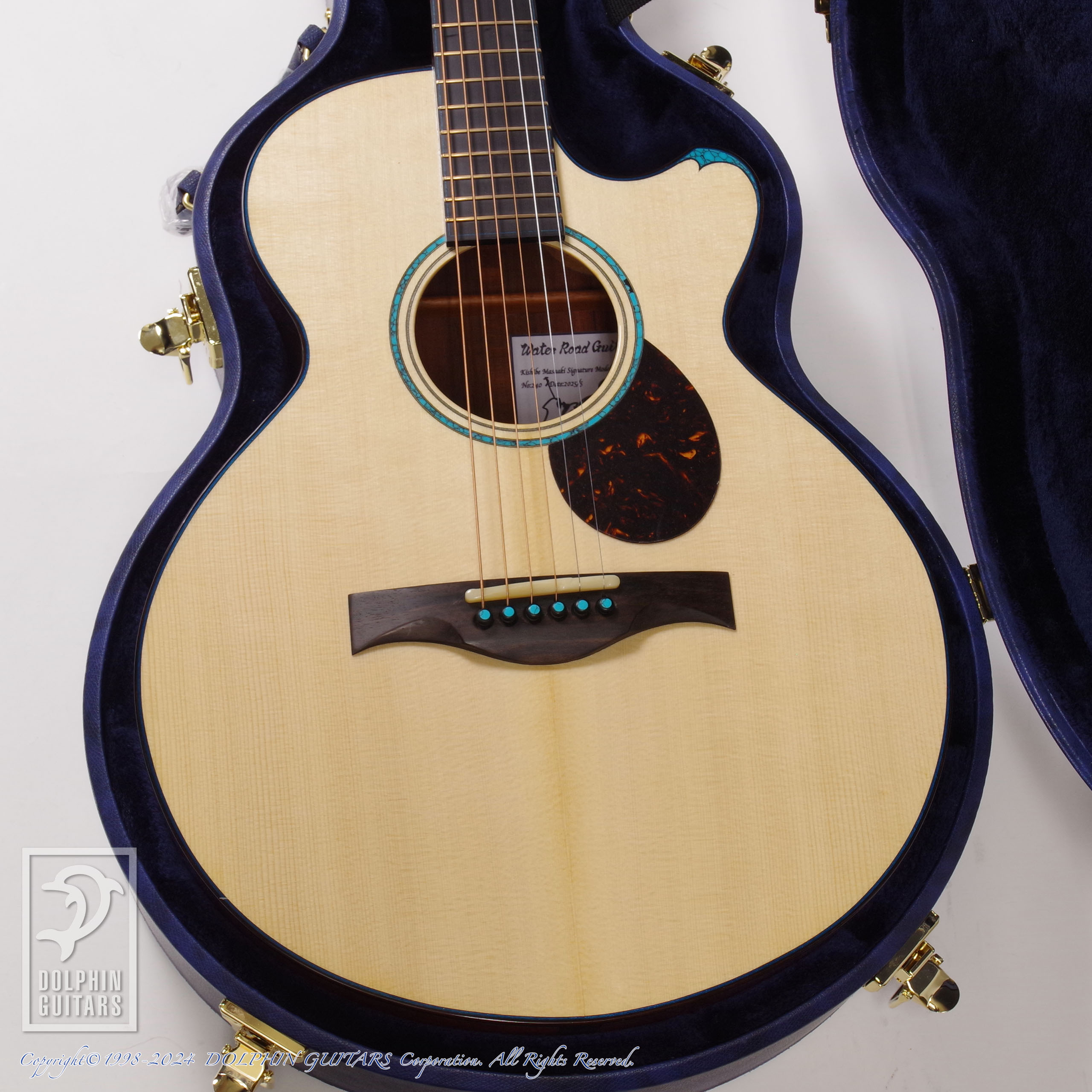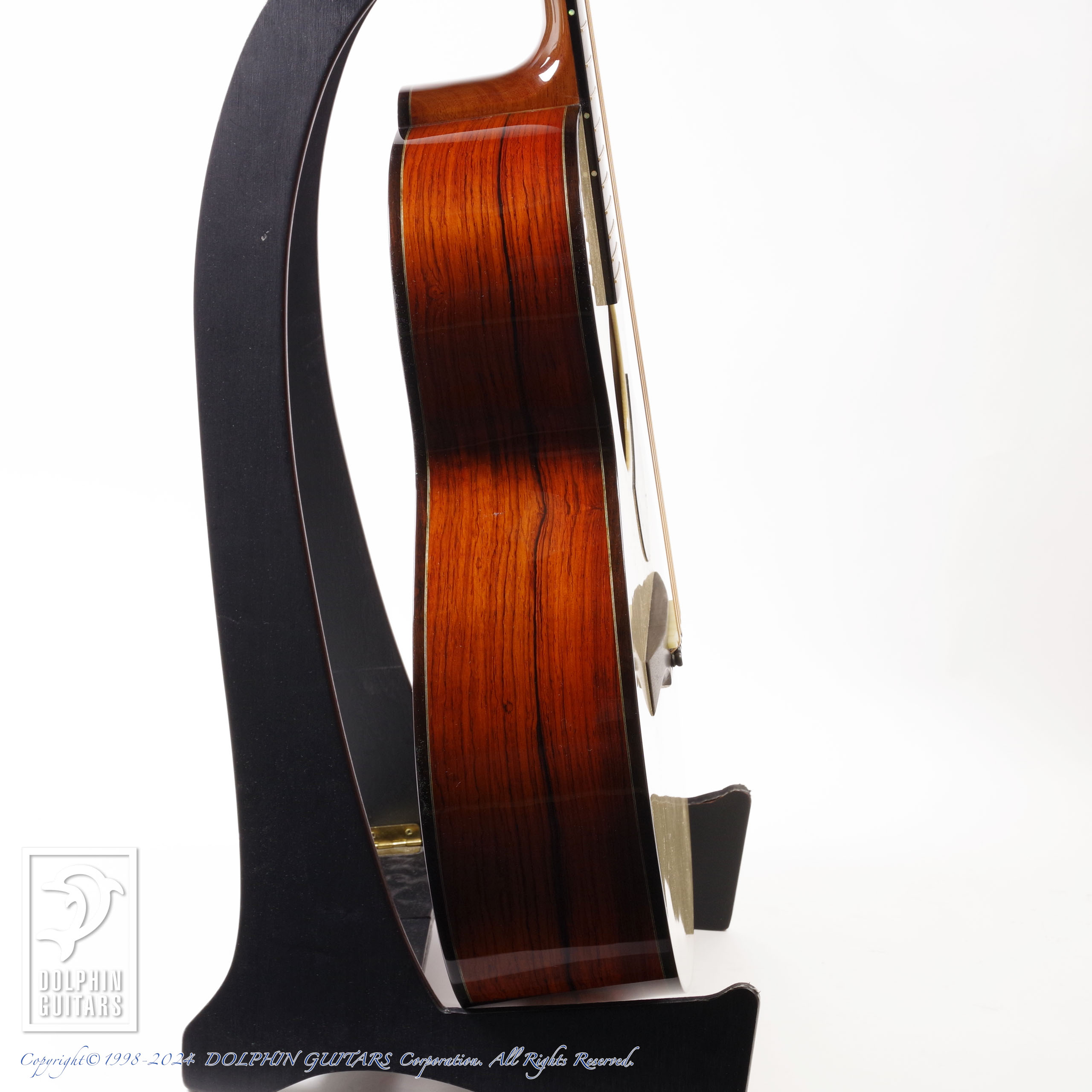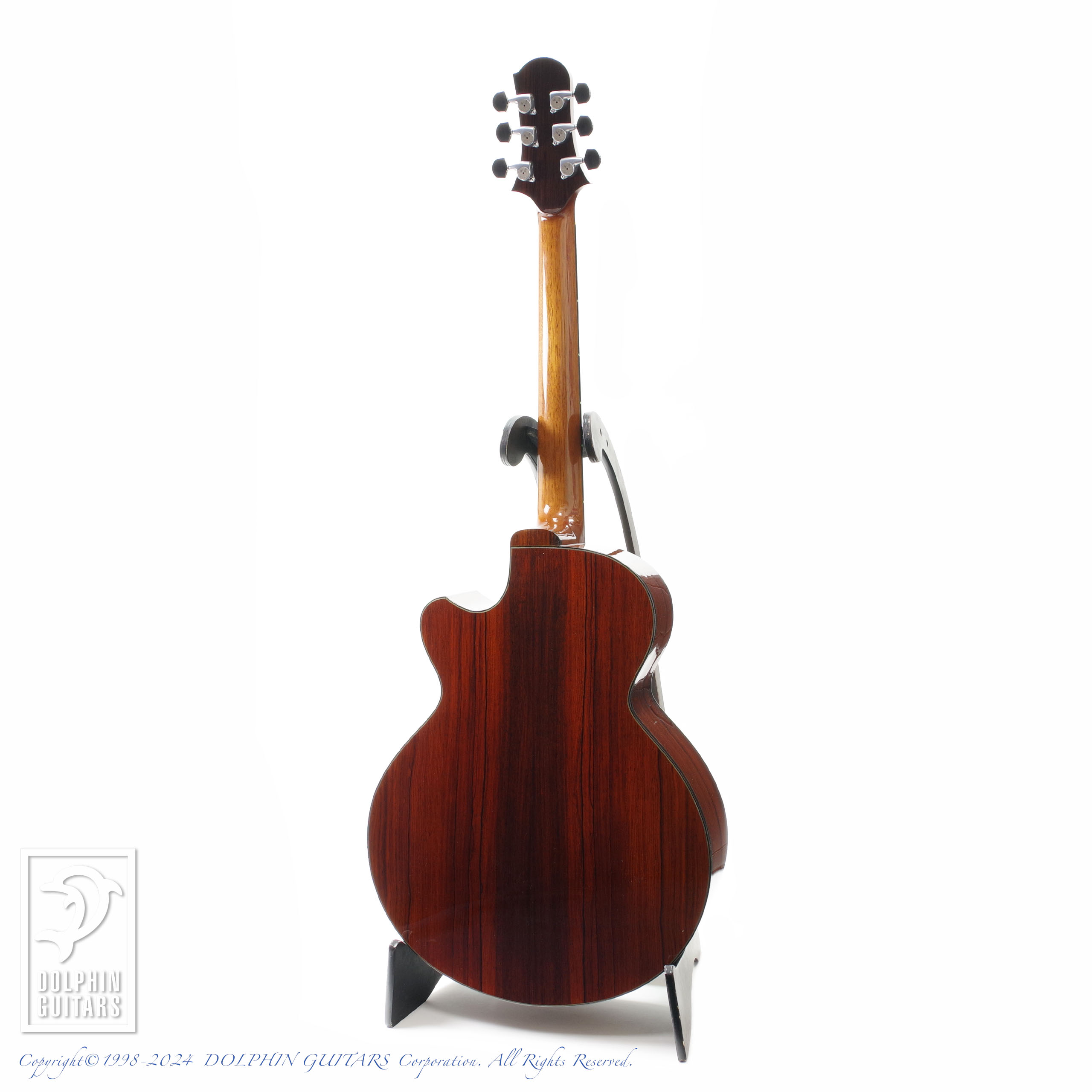 シルキーな木目のジャーマンスプルースをTopに、柾目の美しい最上級のココボロをS&Bに使用した極上の一本。木目の美しさももちろんですが、ターコイズを用いたロゼッタ装飾や独自のカッタウェイ形状などの小粋なデザインも見所の一つです。